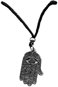 by Catherine Yronwode ... The Eye-in-Hand is an old and still popular apotropaic amulet for protection from the evil eye. [In Turkey, Azerbaijan, Iran and Greece the protection-against-the-evil-eye amulet is known as a nazar. tpk] Combining the imagery of Greek and Turkish blue eye charms with the downward-facing Arab and Israeli hamsa hand, the Eye-in-Hand is common in India and the southern Mediterranean region.The three modern Eye-in-Hand amulets shown here are 3/4 of an inch to one inch in length. From left to right they are: